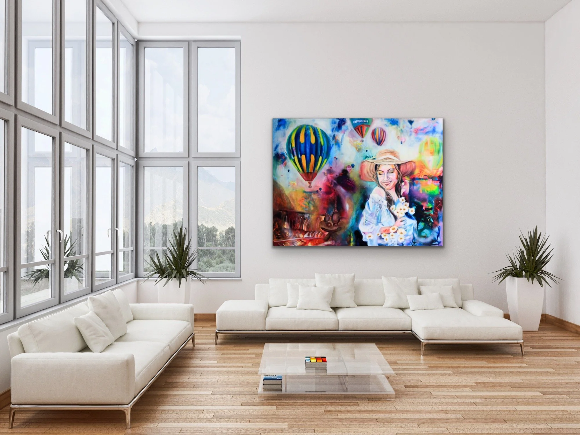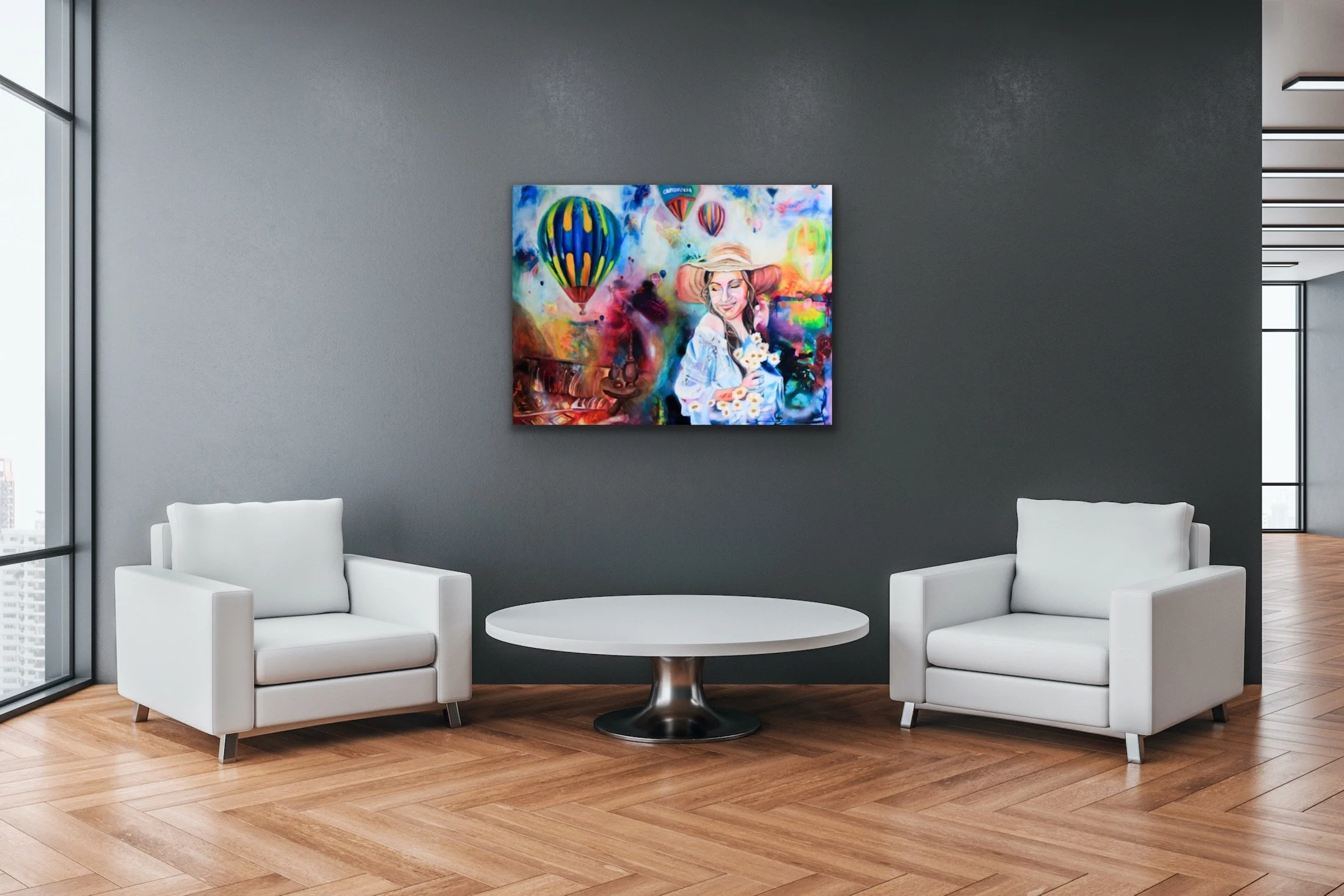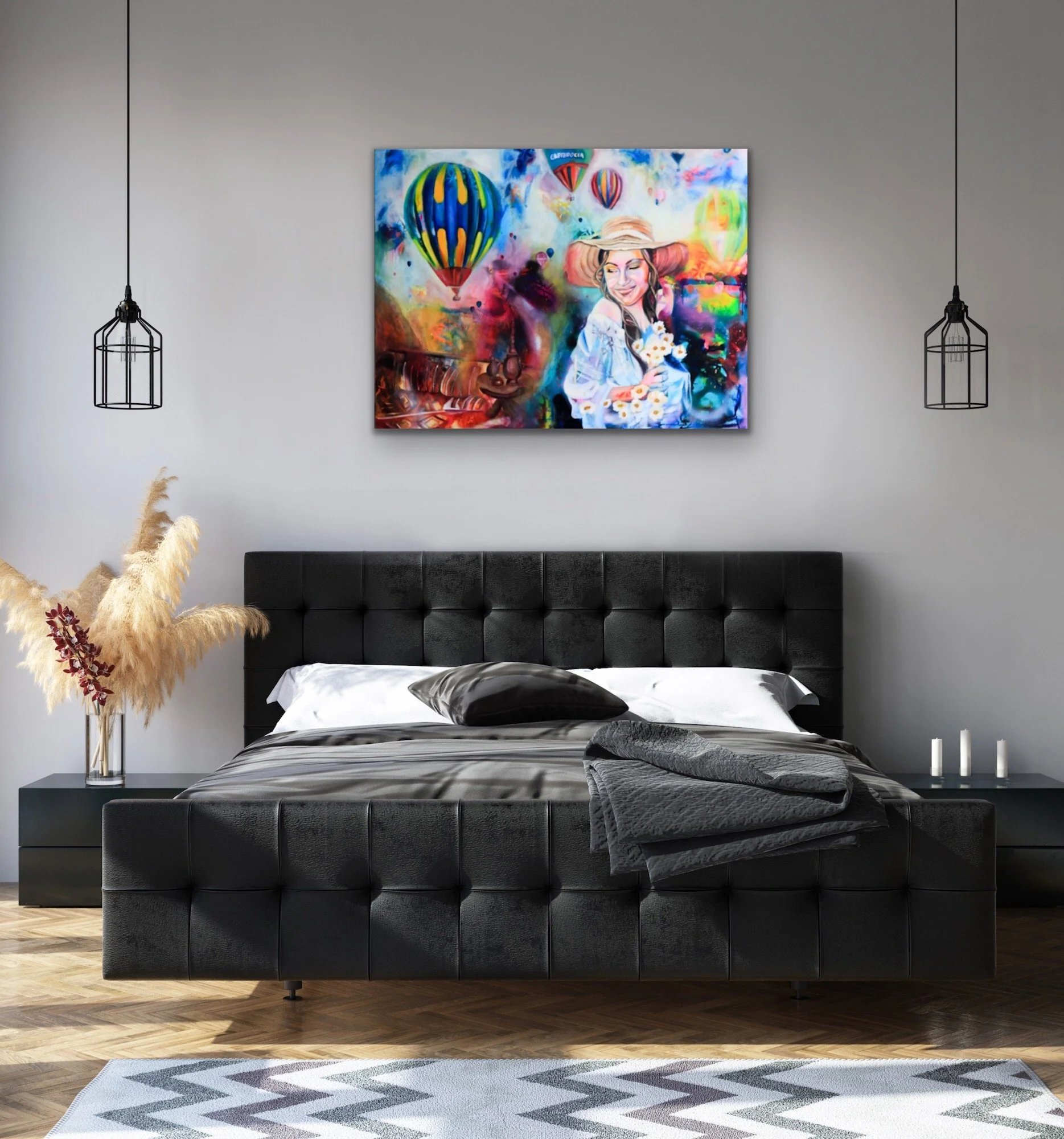 This painting takes you to a whimsical fairytale by floating in colourful hot air balloon above the fairy chimneys, sureal moonscape, curvaceous landscape, honeycombed hills and towering boulders of otherworldly beauty.