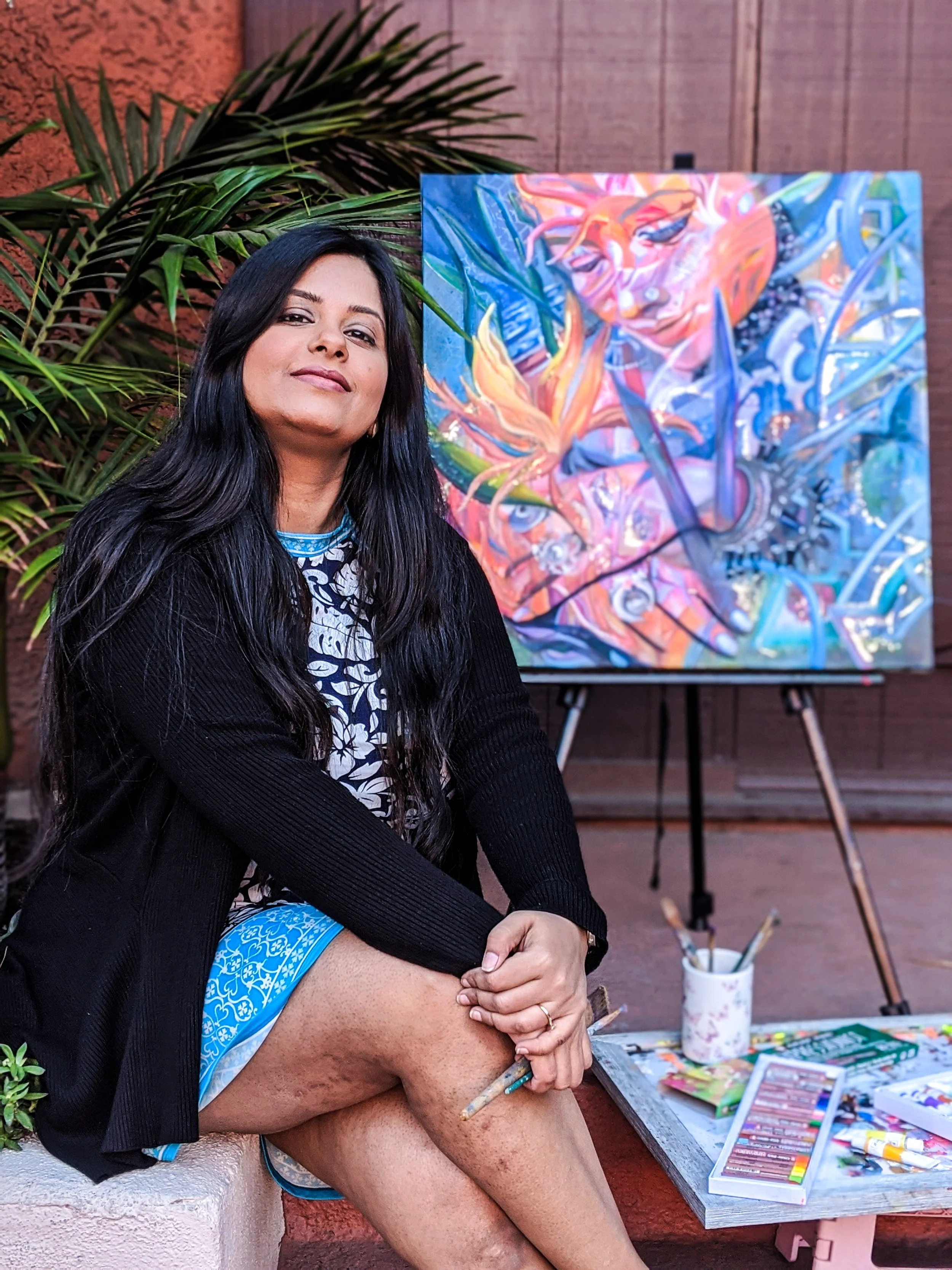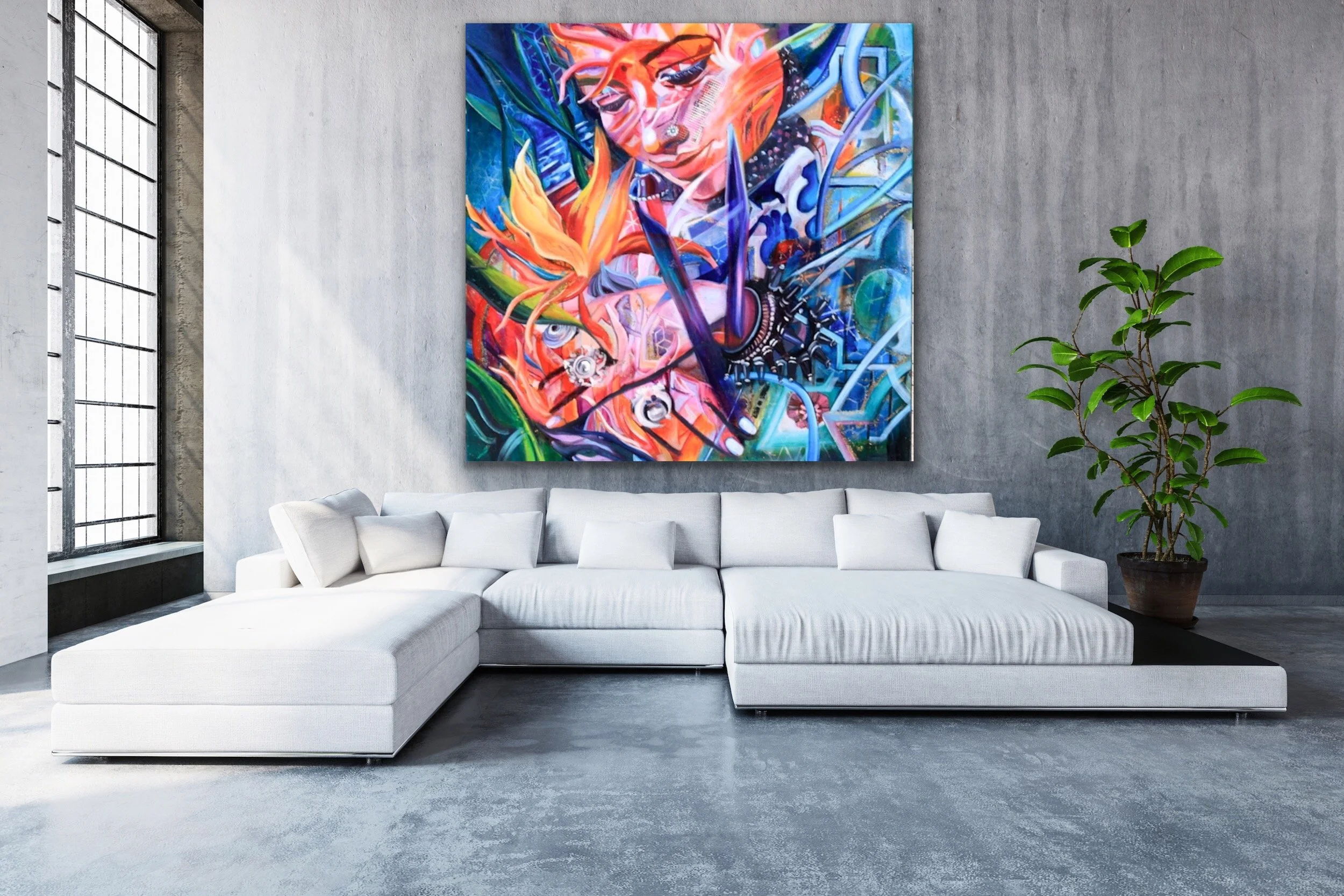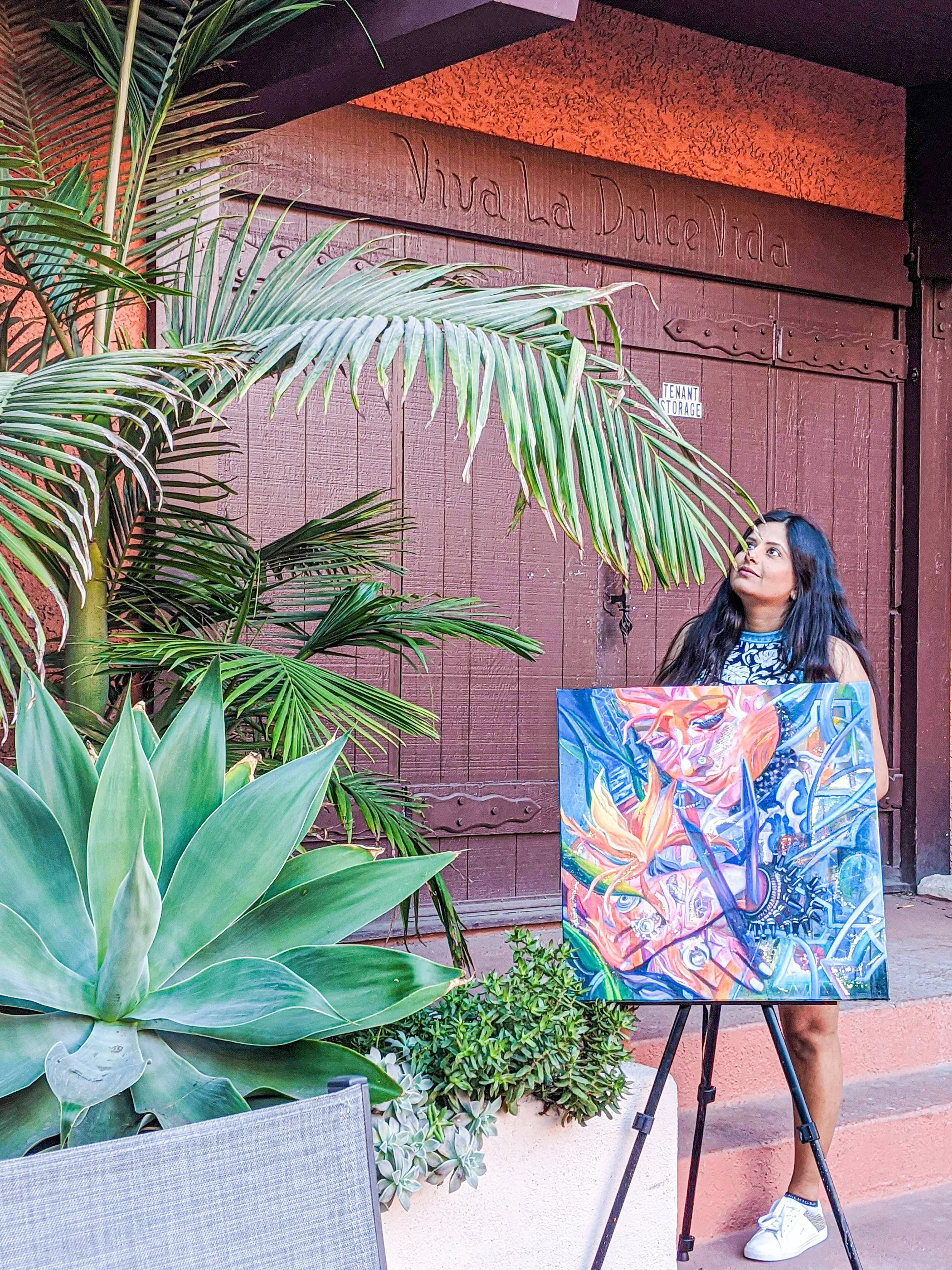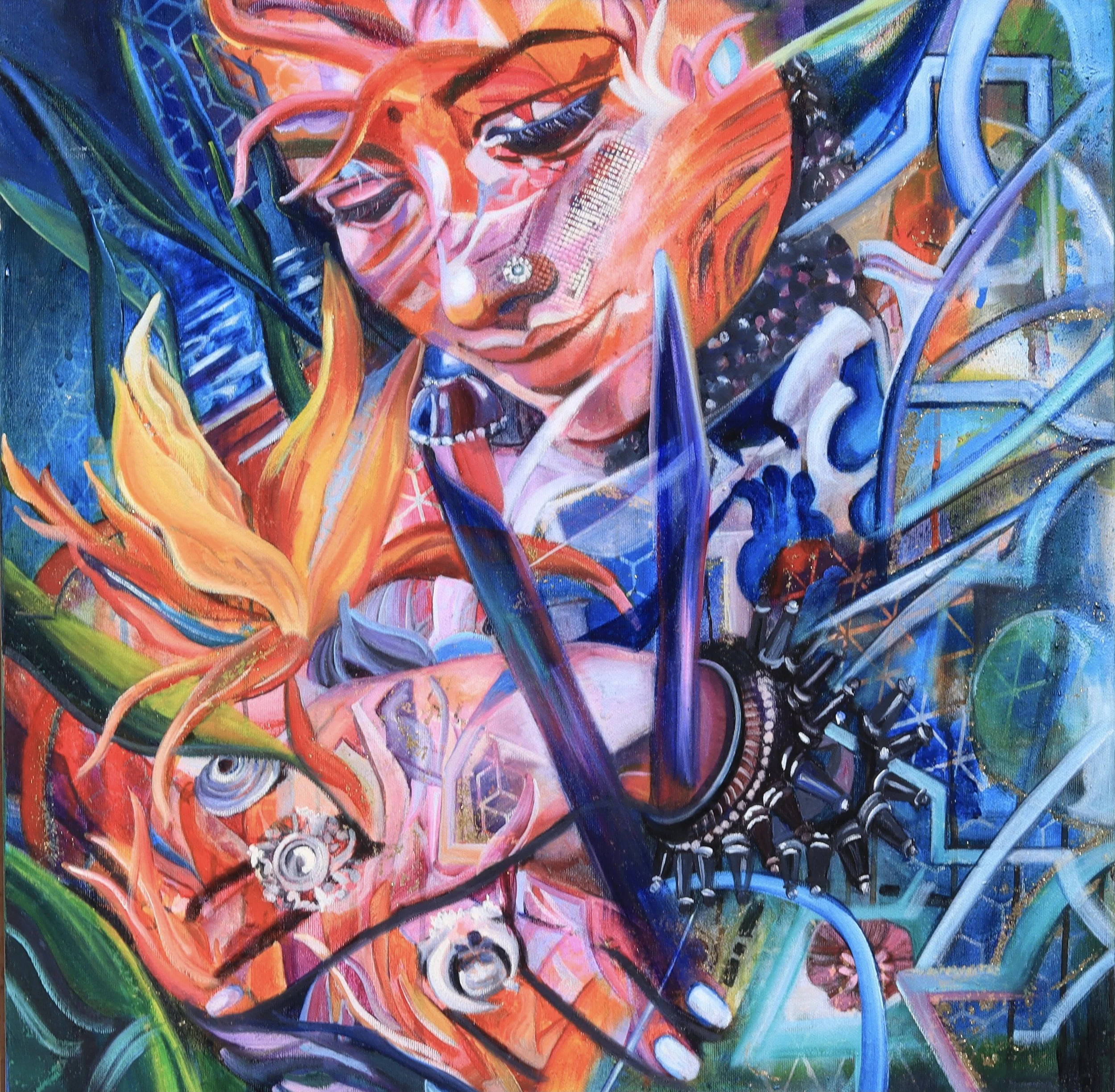 Inspired by the Bird of Paradise flower, this painting portrays the true heart of joyfulness and elegance. It mirrors the truth that everyone has that wellspring of joy in them; everyone deserves to be seen as magnificent, even in our global diversity.